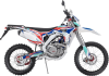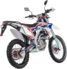 На мотоцикле установлено все необходимое для оффроуда: вилка “перевертыш”, литые рычаги задней прогрессии, алюминиевый маятник, прочный задний бугель, “злая” внедорожная резина Kenda. А также: усиленные легкосплавные колёсные диски MOJO, усиленная цепь, защита рук, датчик моточасов, прочные анодированные CNC ступицы, колесные подшипники NTN, защита коллектора, картера двигателя и тормозных дисков. Мощная гидравлическая тормозная система HSК Racing остановит байк в любых условиях.